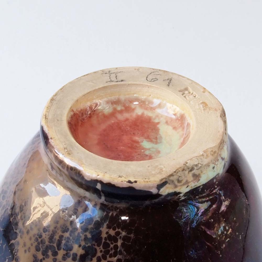 Thrown ceramic vase from the studio Reuss. This vase was produced in a reduction fire. It probably dates back to the 1930s [1]. Gusso (Gustav Otto) Reuss was known for his glaze experiments, which aimed to rediscover, in particular, Chinese glaze techniques from the Sung period and the Kang-Hsi period. In 1927 Gusso Reuss exposed his ceramics with reduction glazes for the first time [2].