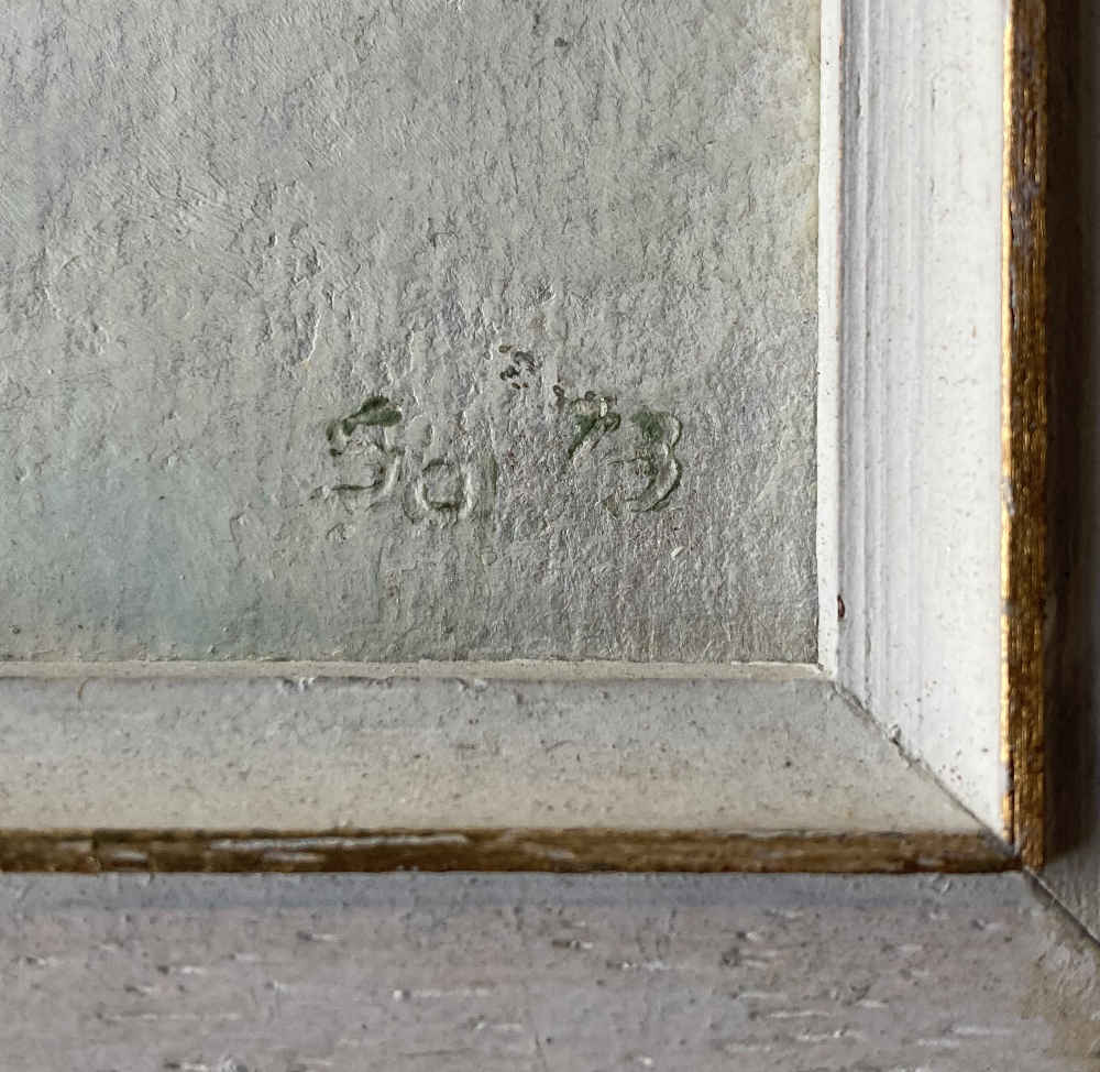 Condition: painting undamaged; frame has partial stains, impressions, abrasions and bumps