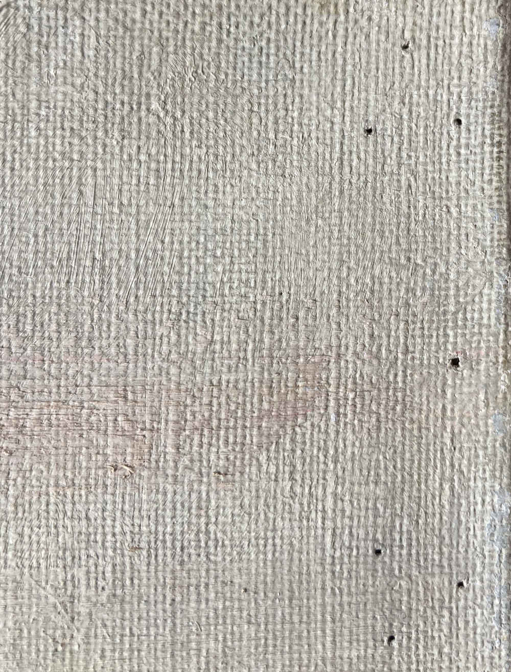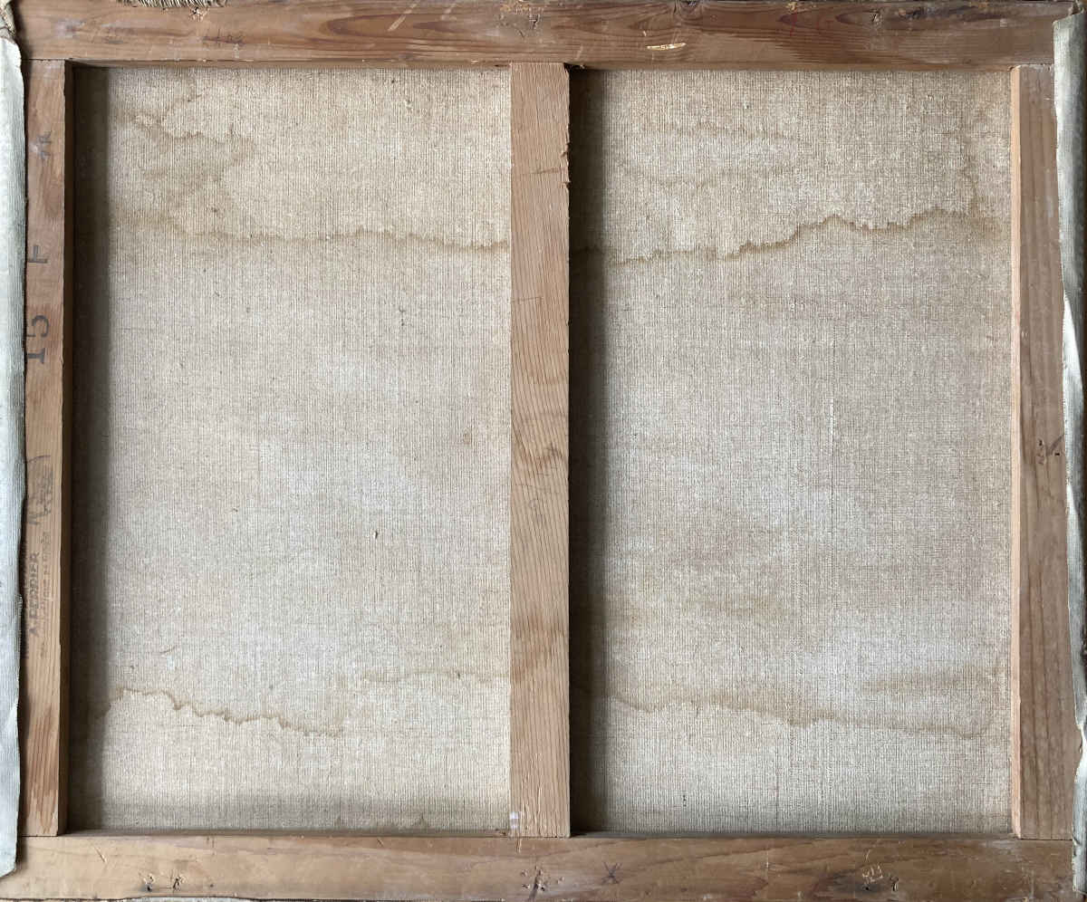 Estado: pérdida parcial de color en el cuadro, especialmente en el borde; algunos agujeros muy pequeños en el borde del cuadro; lienzo parcialmente perforado en los lados doblados del bastidor, lo que no sería visible en un marco; manchas de agua visibles en el reverso; por lo demás, en buen estado para la época