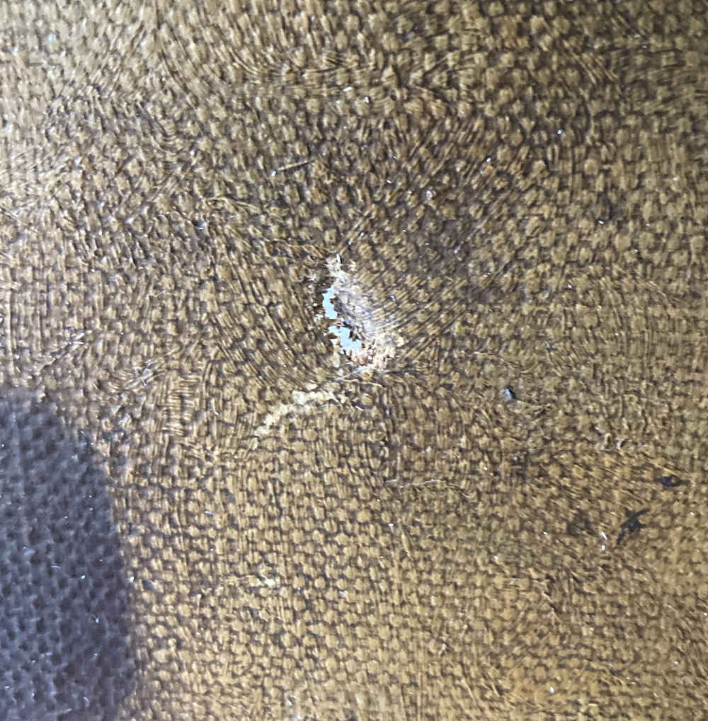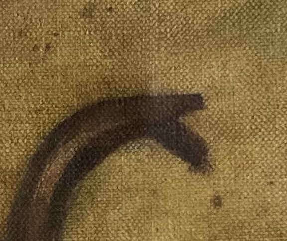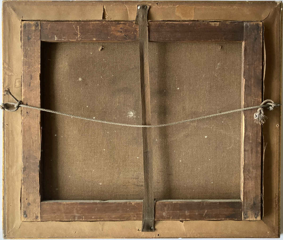 Estado: El cuadro tiene dos abolladuras, desgaste parcial del color y una pequeña rasgadura; el marco tiene varios desconchones