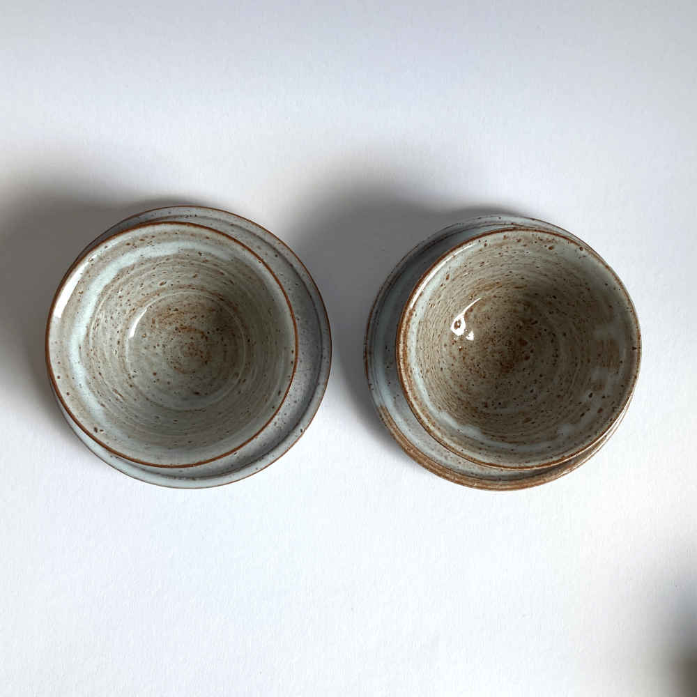 HET KRUIKJE (Marguerite FRIEDLAENDER-WILDENHAIN) [atribuido] – Dos tazas con platillos en estilo Bauhaus – cerámica de taller