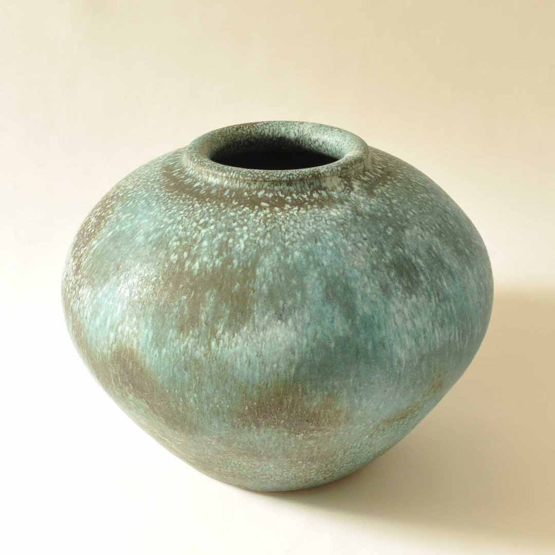 Fantástico jarrón del taller Hohlt. Probablemente se fabricó a principios de los años 50. La pieza tiene un tamaño impresionante. El esmalte mate juega con los colores verde, blanco y negro.