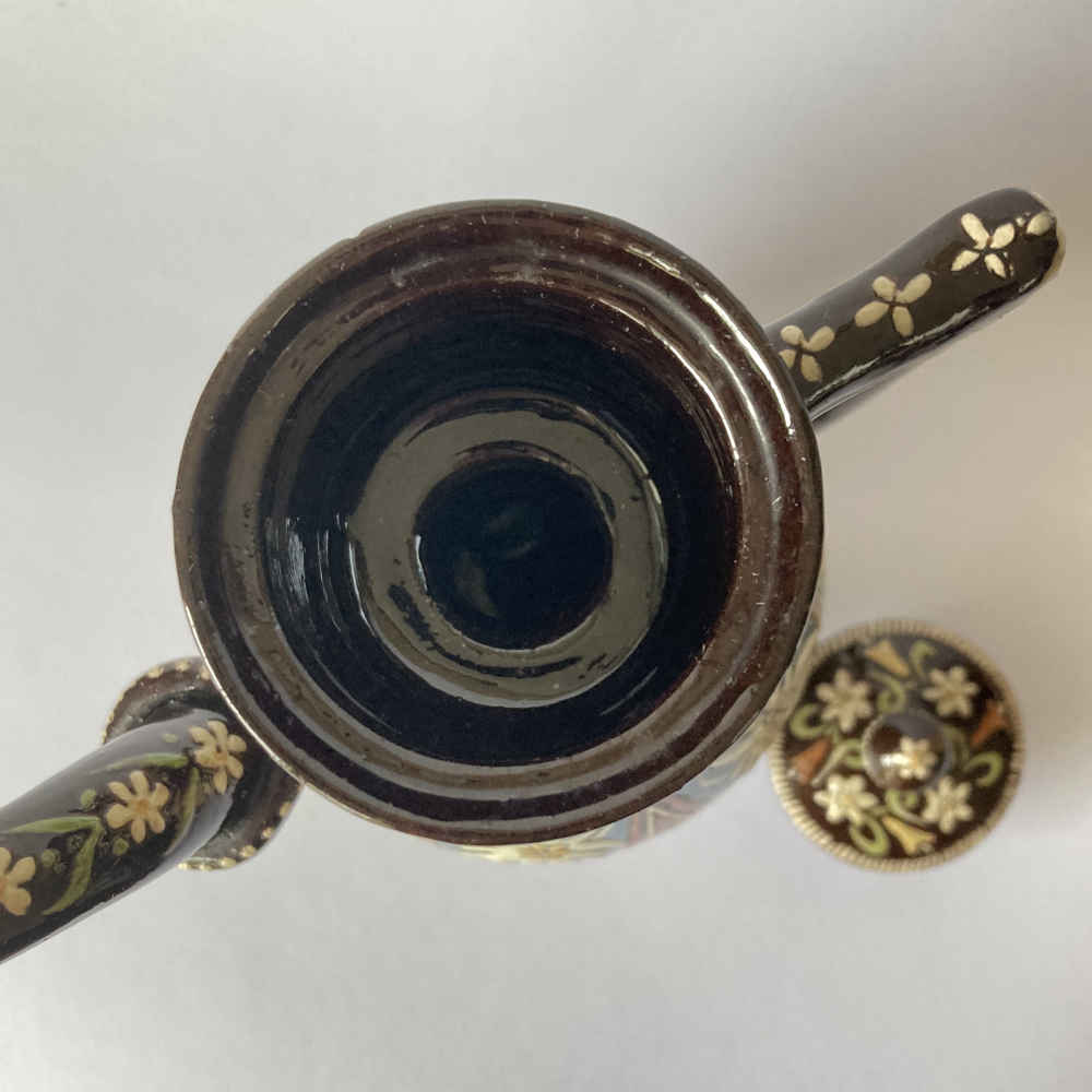 État : quelques éclats au niveau de la bouche du bec verseur, bord supérieur de la cafetière et du couvercle ; sinon, très bon état.