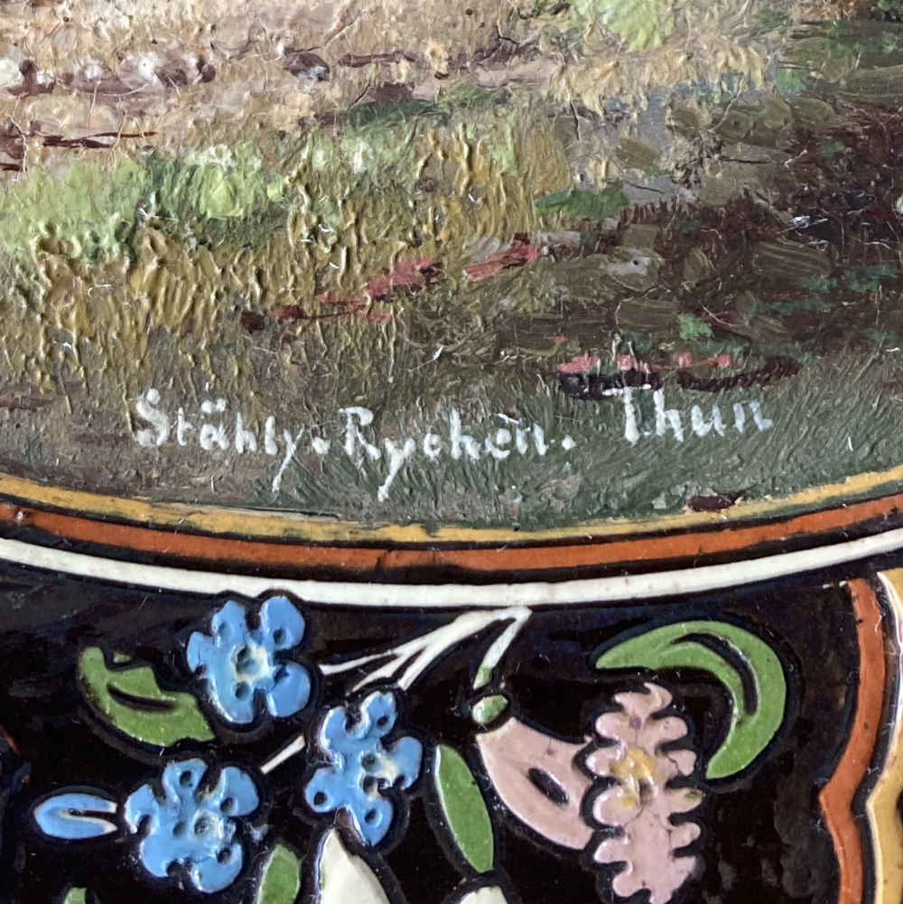 Signature/marque : derrière : M C, entre les deux une fleur d’edelweiss, en bas Thoune ; M C signifie Musée Céramique ; devant : Stähly-Rychen. Thun