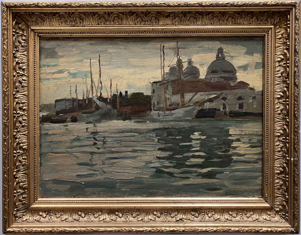 Une superbe peinture à l’huile d’Otto Reiniger, le maître de l’eau qui coule, représentant une vue de Venise, et plus précisément la basilique Santa Maria della Salute vue depuis le bassin de Saint-Marc.