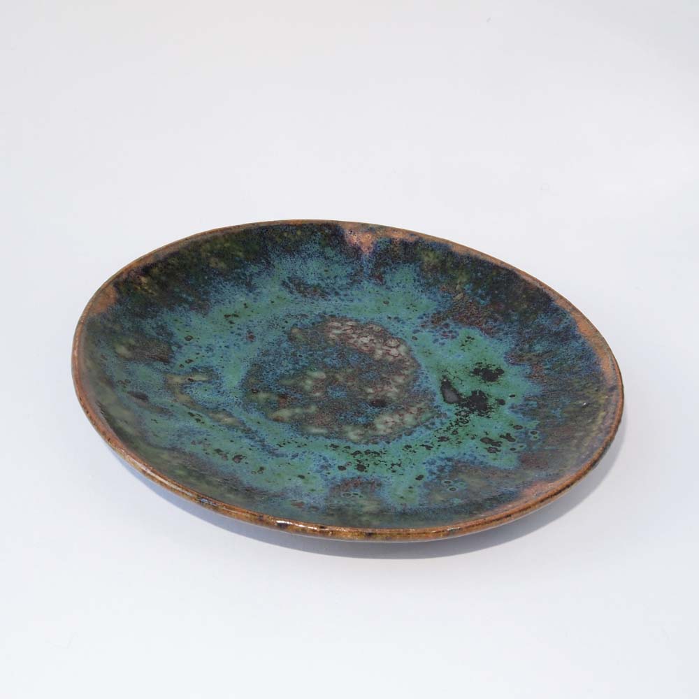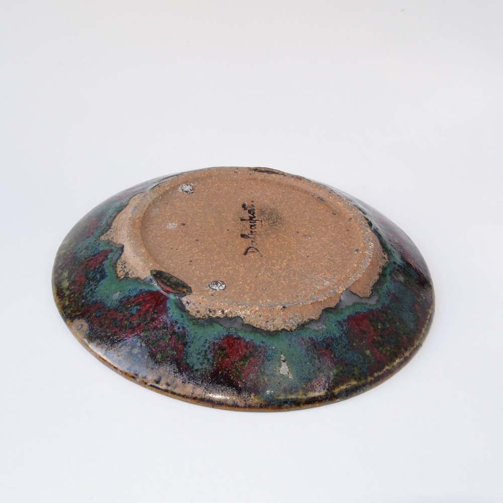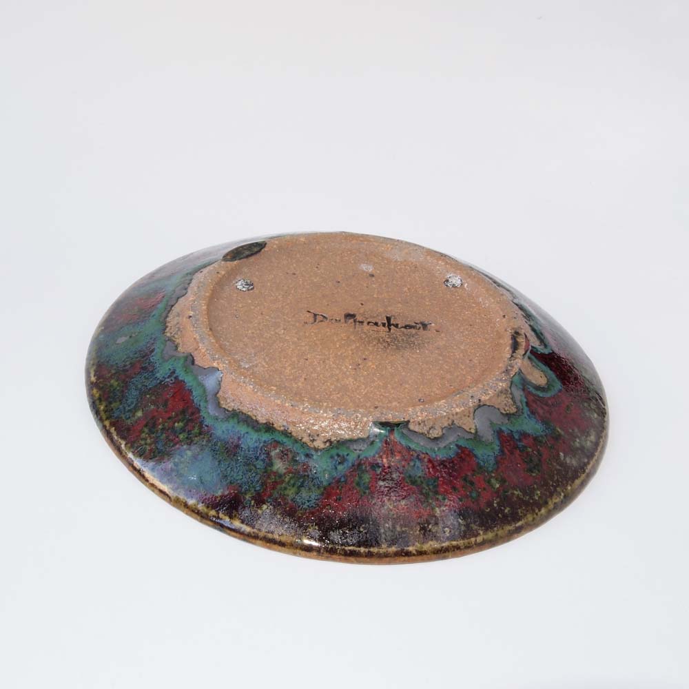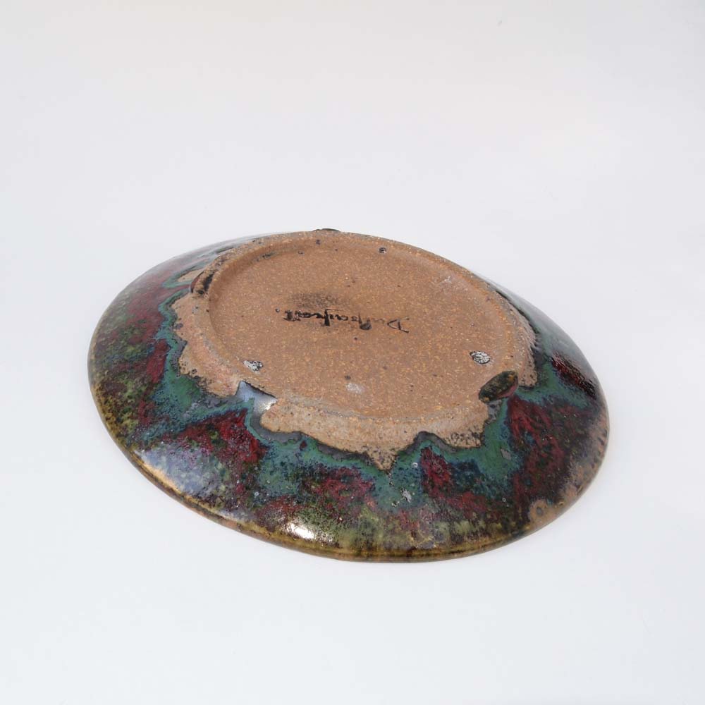 Assiette en céramique moulée de l’atelier Dalpayrat. Pierre-Adrien Dalpayrat est notamment connu pour ses émaux sang de bœuf. C’est pourquoi son rouge sang de bœuf a reçu le nom de « rouge Dalpayrat ».