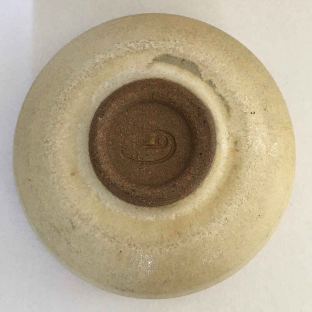 Coupelle en céramique tournée de la manufacture de faïence Richard Bampi, Kandern. Le bol présente un magnifique dessin de mouchetures grises et turquoises sur le bord et se distingue par sa forme anguleuse et rainurée.