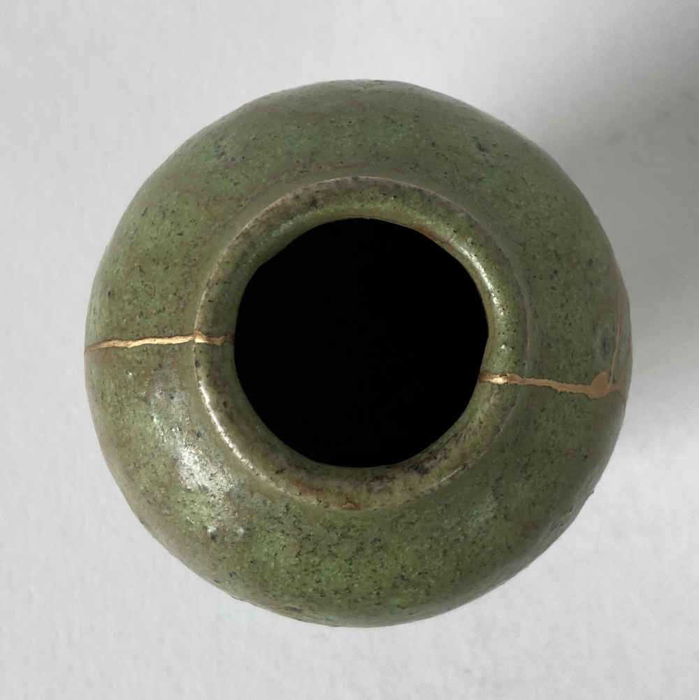 État : Les fissures et les défauts ont été réparés avec la technique du kintsugi ; finition du métal uniquement à l’extérieur ; le laiton a été utilisé à la place de l’or.