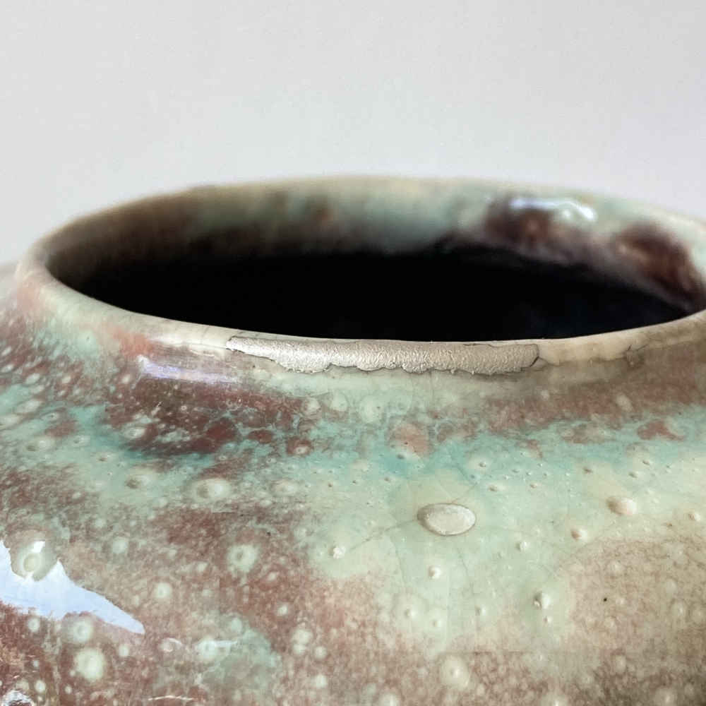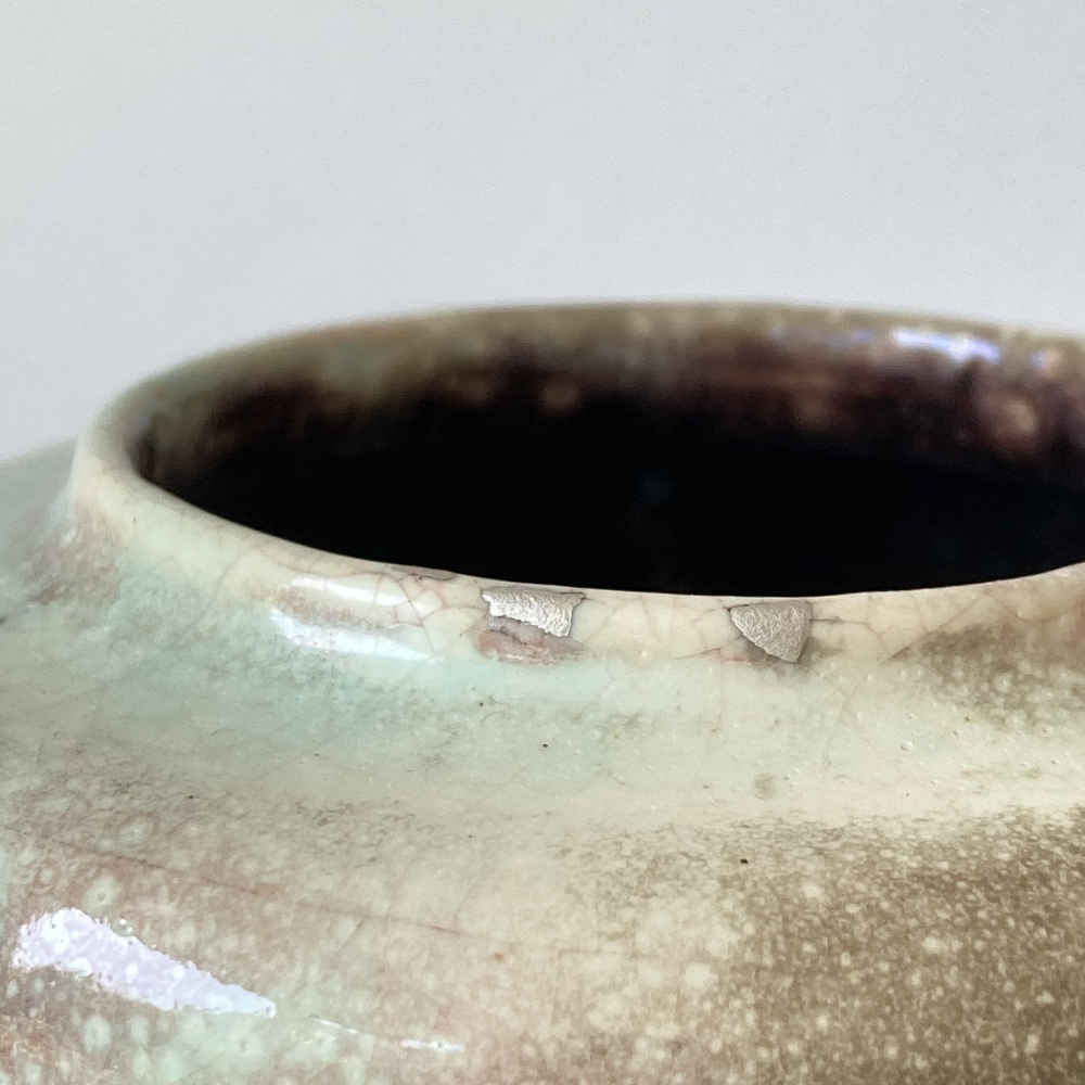Zustand: unterschiedliche kleine Bestoßungen am Mund und Fuß durch Gintsugi-Reparatur-Methode mit Silberlack repariert.
