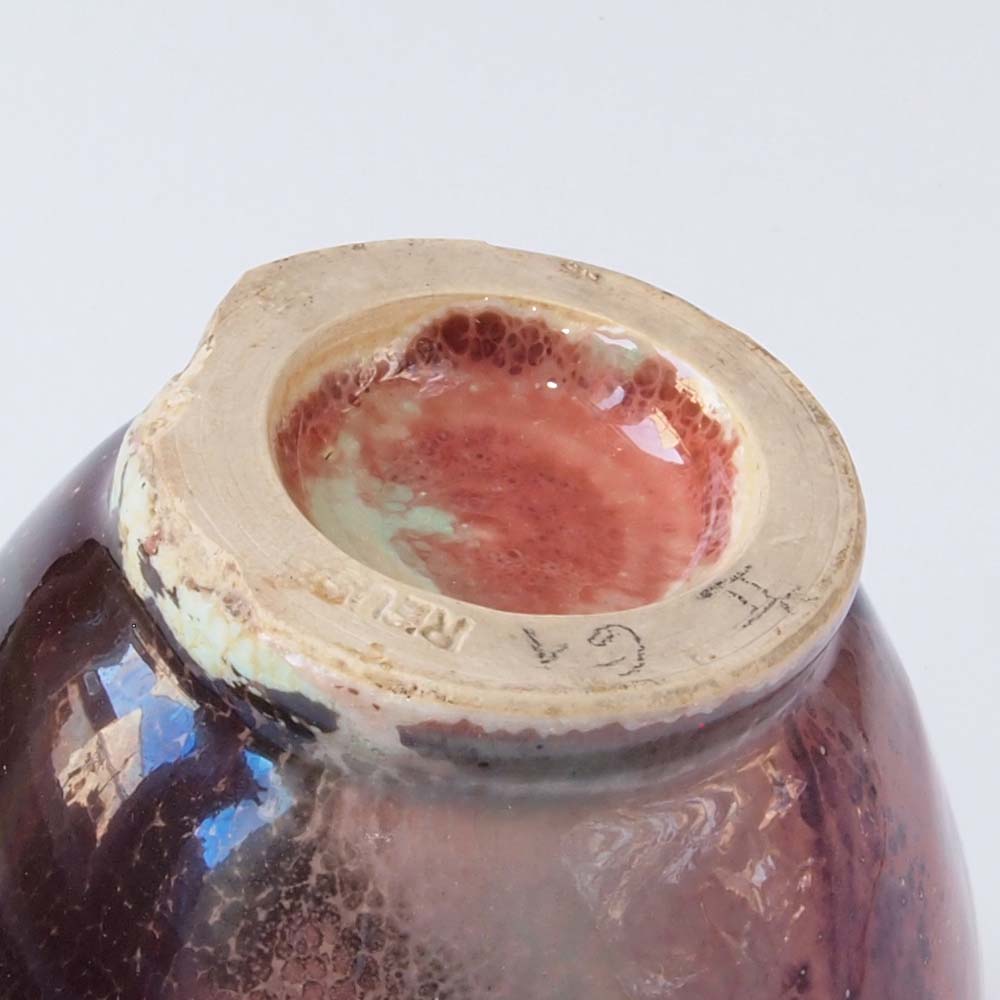 Gedrehte Keramik-Vase aus der Werkstatt Reuss. Diese Vase hier, im Reduktionsbrand hergestellt, stammt wahrscheinlich aus den 1930er Jahren [1]. Gusso (Gustav Otto) Reuss war für seine Glasurexperimente bekannt, die bezweckten, insbesondere chinesische Glasurtechniken aus der Sung-Zeit und der Kang-Hsi-Zeit wieder zu entdecken. Seine Keramiken mit Reduktionsglasuren stellte Gusso Reuss erstmals 1927 aus [2].