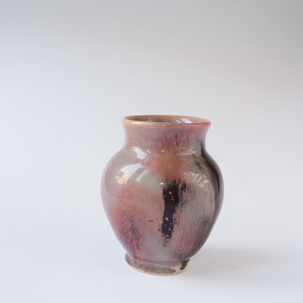 Oberfläche: die Glasur ist rauchgrau, rosa, pflaumenrot und braun, weiß, kleiner Anteil Lüsterglasur