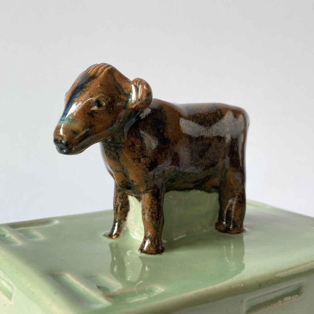 Superficie: verde, bianco, marrone tenmoku, un po’ di blu nel muso della mucca