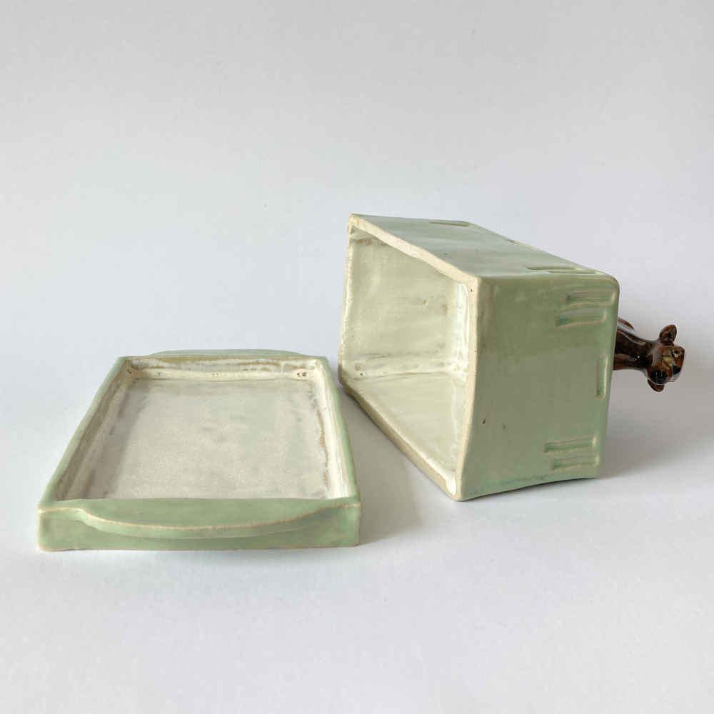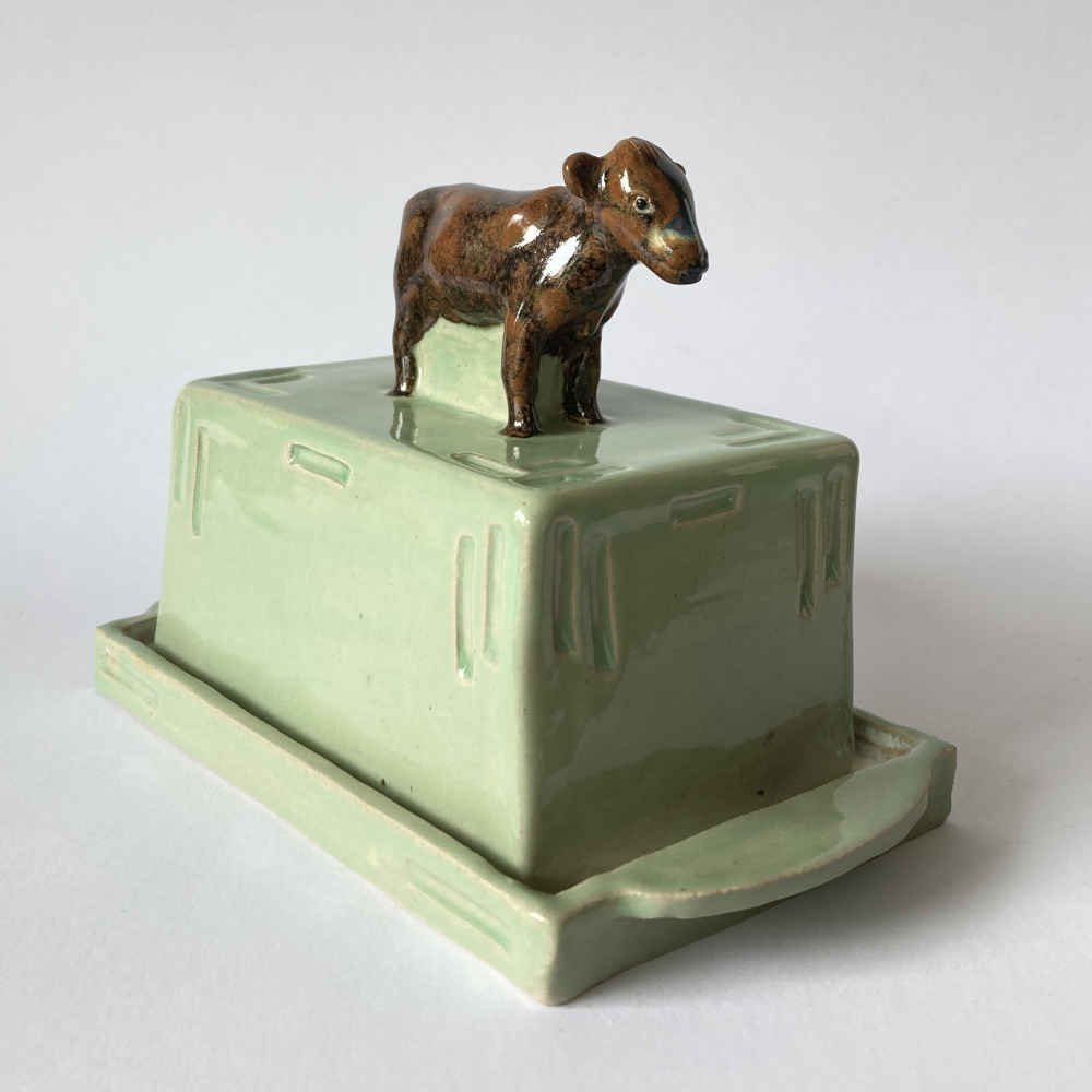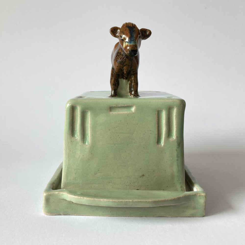 Il manico del coperchio di questo portaburro è una mucca con smalto Tenmoku. Il motivo del portaburro si rifà allo stile Art Nouveau. Questo portaburro in ceramica a forma di mucca è fatto a mano. L’artista Mila Vázquez Otero lavora senza stampi e modella ogni pezzo di ceramica individualmente a mano, in modo che ogni pezzo sia unico.
