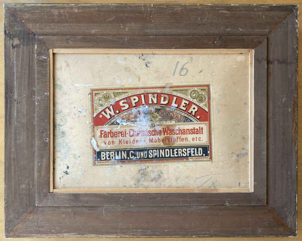 Sul retro è presente un’etichetta della ditta “W. Spindler”, che probabilmente ha fornito il cartone su cui è dipinto il quadro. L’etichetta recita “W. Spindler. Färberei-Chemische Waschanstalt von Kleidern, Möbelstoffen, etc., BERLIN, C. UND SPINDLERSFELD”