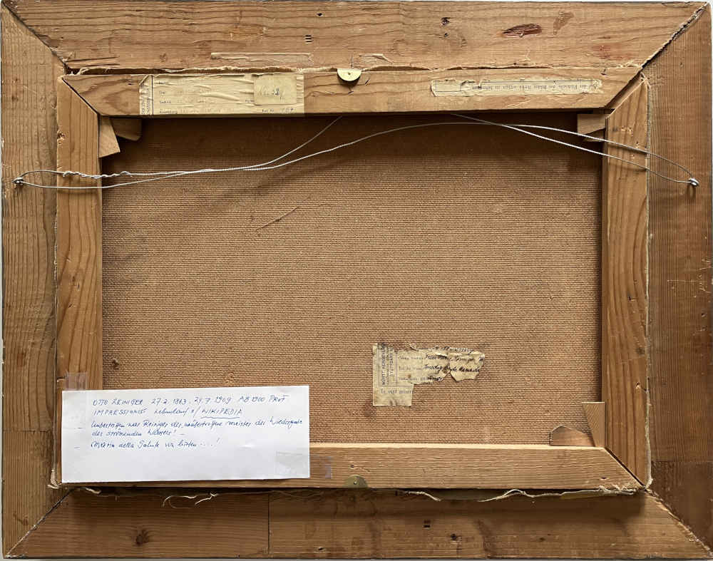 Signatur: unsigniert. Auf der Rückseite klebt ein Etikett mit Informationen von der Galerie der Stadt Stuttgart bezüglich der 1964er Ausstellung, die Hermann Pleuer und Otto Reiniger gewidmet war.