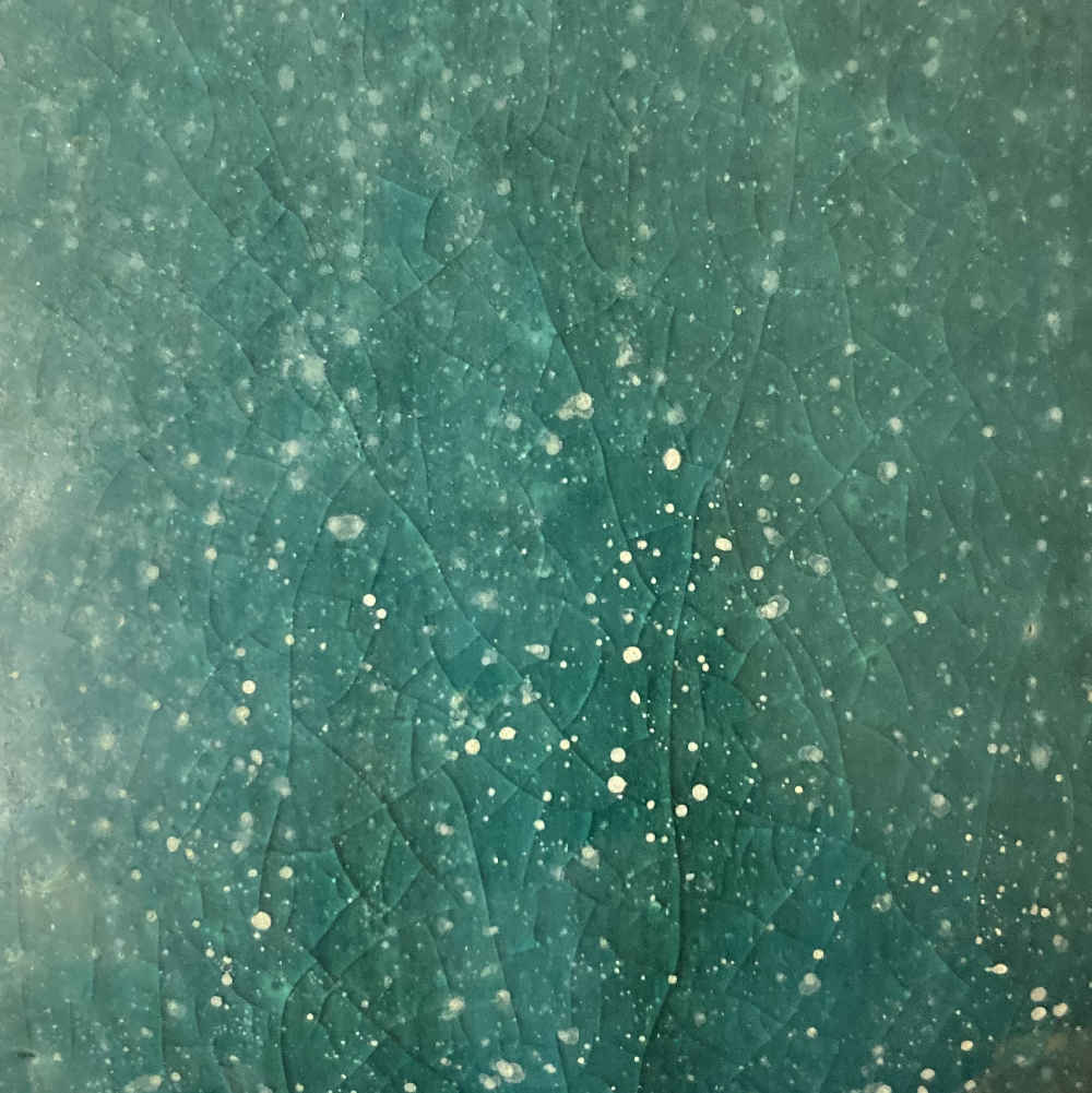 Oberfläche: blau-grün, gelb gesprenkelte Glasur und braune Engobe